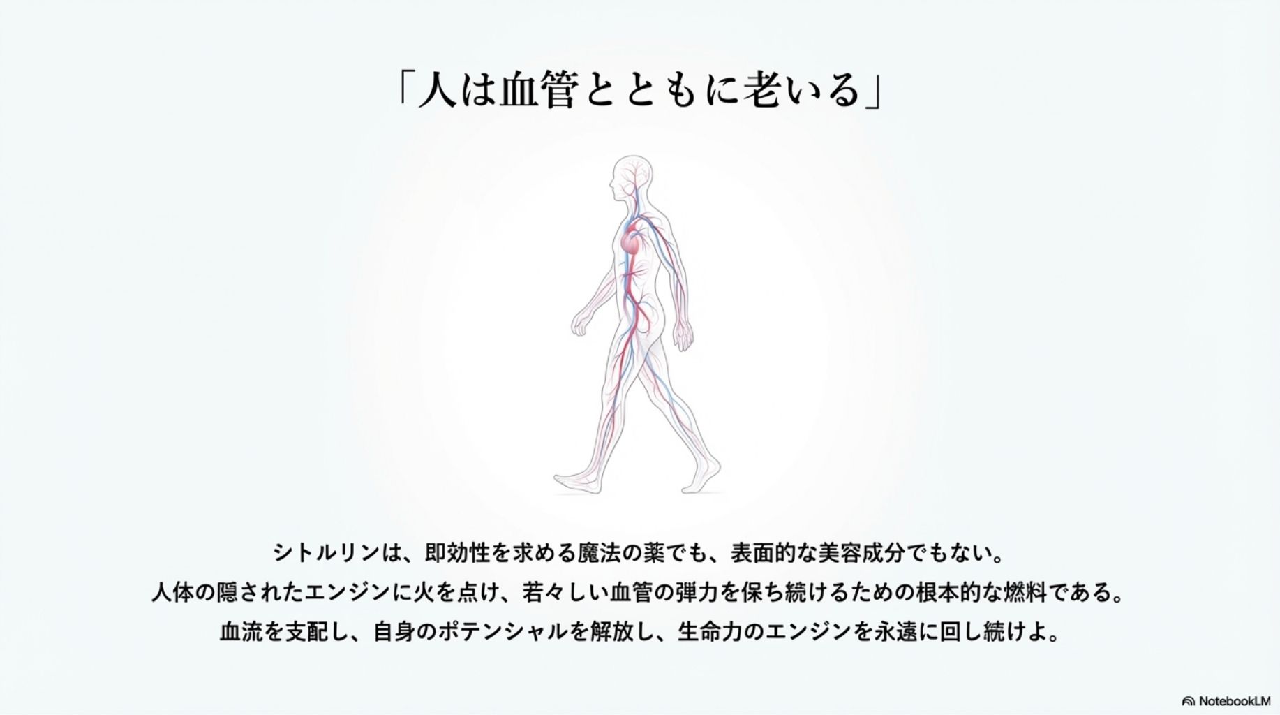 。血管の健康維持という土台から、運動パフォーマンスの限界突破、内面からの美しさ、さらには脳の活性化まで、これら二つのアミノ酸がもたらす広範なメリットを最大限に享受していただくためのロードマップを提示することです。「人は血管とともに老いる」という言葉がありますが、これは逆に言えば、血管を若々しく保つことで、人生の質はどこまでも高められるということです。さあ、あなたの身体の中で起こる驚異のメカニズムを一緒に見ていきましょう。
