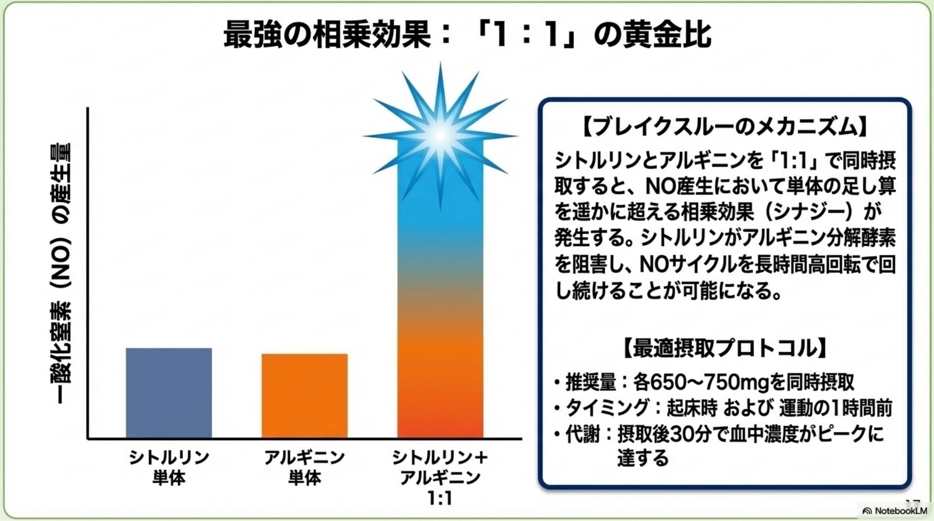 協和発酵バイオの研究により、シトルリンとアルギニンを「1:1」の比率で同時摂取することで、NOの産生作用が最大化されることが判明しました。これは、単なる足し算ではありません。互いの弱点を補い合い、強みを引き出し合う、まさに最強のタッグと言えるでしょう。