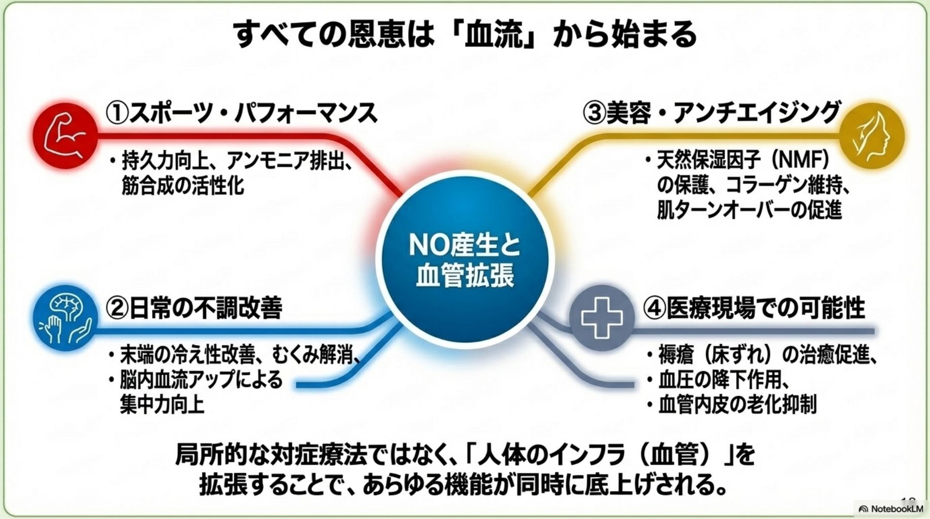 血流の改善は、全身のパフォーマンスに直結します。血管の健康を整えることは、あなたのQOL(生活の質)を根本から引き上げることなのです。