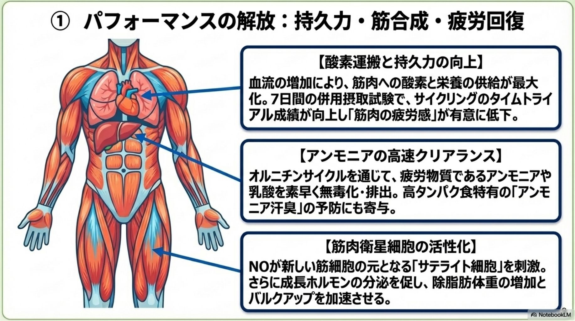 ●筋肉衛星細胞の活性化: NOが、将来の筋肉細胞の元となる「衛星細胞」を活性化させ、筋肉の修復と成長を促します。●成長ホルモンの分泌促進: アルギニンの作用で成長ホルモンの分泌が促され、筋肉のバルクアップを加速させます。