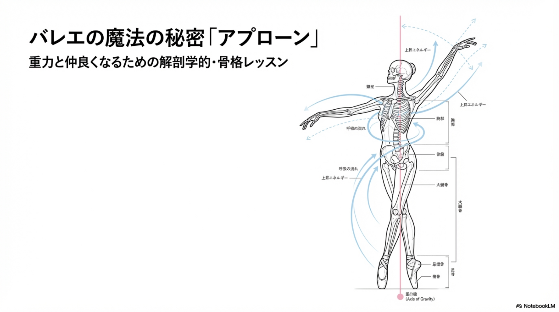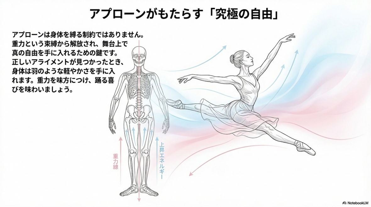 アプローンの習得は、身体を縛る制約ではありません。むしろ、表現者として重力という束縛から解放され、真の自由を手に入れるための鍵です。もしあなたが今、「軸が取れない」「引き上がらない」と悩んでいるのなら、それはあなたの筋力が足りないのでも、才能がないのでもありません。単に、積み木の配置が数ミリずれているだけなのです。がむしゃらな練習を一度止め、鏡の前で自分の中に「下げ振りの糸」を通す静かな時間を持ってください。正しいアライメントが見つかったとき、あなたの身体は羽のような軽やかさを手に入れます。重力を味方につけ、舞台の上で「芸術そのもの」として存在する瞬間――その究極の快感を目指して、今日からまた一歩ずつ、あなたの「揺るぎない軸」を育てていきましょう。私はあなたのその挑戦を、心から応援しています。