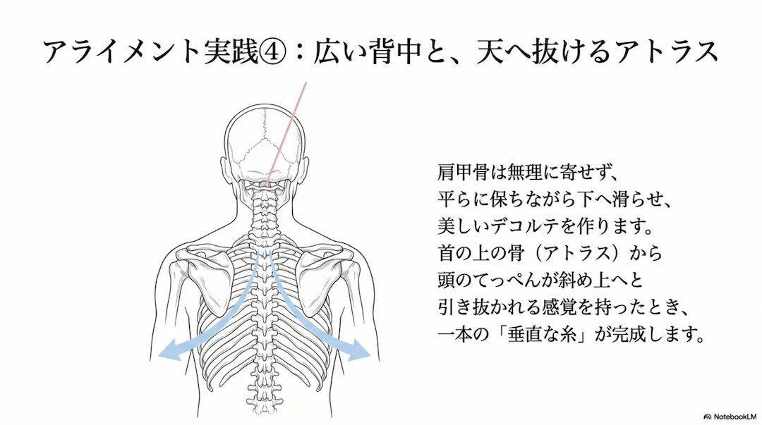 ●アトラスを天へ届けましょう: 顎を引きすぎず、頭頂部から**「少し前、斜め上」**へと引き抜かれる感覚を持ちます。これらの意識が一本の「垂直な糸」として統合されたとき、あなたは不要な緊張から解き放たれます。アプローンが完成した瞬間、身体は「重い物質」から「軽やかなエネルギー」へと変化するのです。