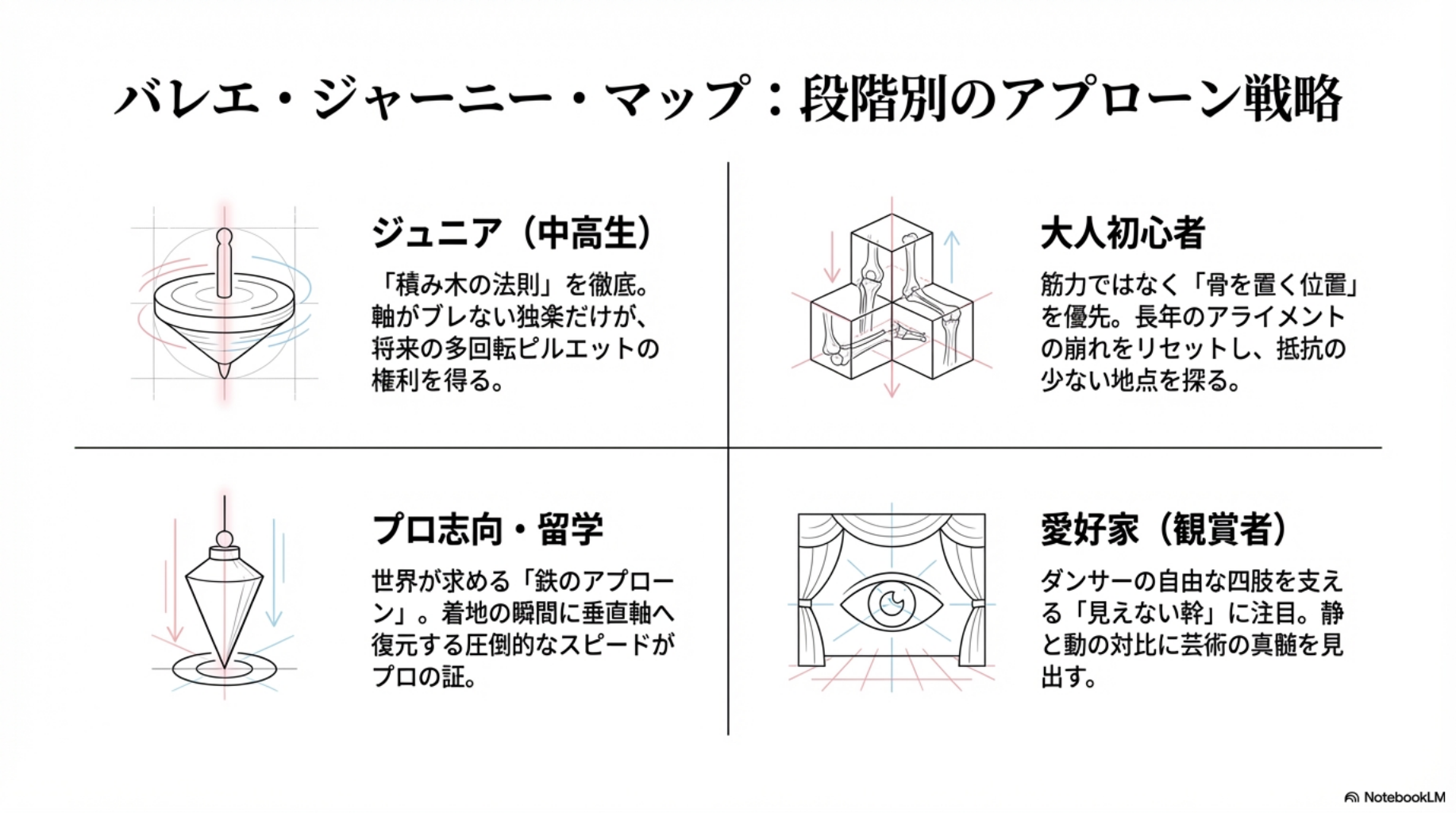 ●ジュニア(中高生): テクニックに目を奪われがちな時期ですが、今こそ「積み木の法則」を身体に叩き込んでください。軸がブレない独楽だけが、将来、何回転ものピルエットを成功させる権利を得るのです。