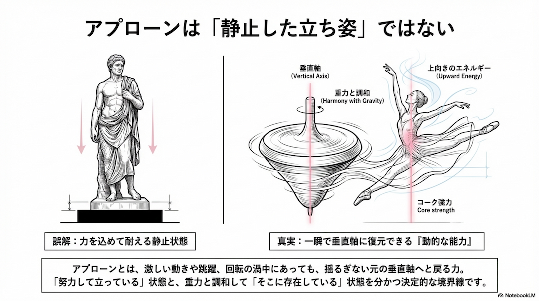 ●威厳(Poise): 軸の安定が精神的な余裕を生み、観客を魅了する気品(オーラ)。物理的な「垂直線」が正確に身体を貫くとき、ダンサーの脳は「倒れないための微調整」という重労働から解放されます。その余剰エネルギーが、指先の表現や音楽性へと注がれる。これこそが、アプローンが単なる姿勢を超え、芸術的な「オーラ」へと昇華されるメカニズムなのです。