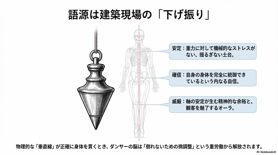 「アプローン」という言葉の真意を理解することは、ダンサーの脳内に揺るぎない幾何学的イメージを構築する第一歩となります。この言葉の語源は、フランス語の「下げ振り(Aplomb)」、すなわち建築現場で垂直を確認するために吊るされる「鉛の重りがついた糸」に由来します。