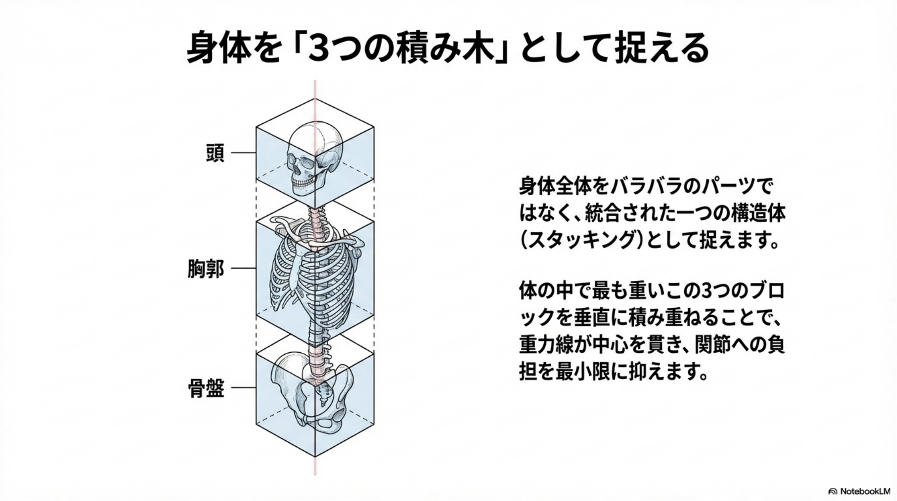 1.骨格のスタッキング(積み木の法則): 身体の中で最も重量のある「頭」「胸郭(肋骨)」「骨盤」の3つのブロックを、足裏という土台の上に垂直に積み重ねます。この配置が整えば、重力の線は構造の中心を貫き、特定の関節への負担を最小限に抑えます。