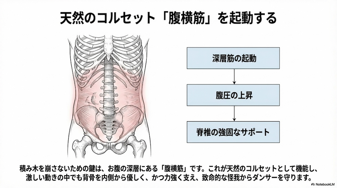 2.深層筋(インナーユニット)の起動: 腹部の深層にある「腹横筋」 を天然の 「コルセット」として機能させ、腹圧を高めます。これにより、脊椎を内側から強固にサポートし、激しい動きの中でも軸を保持します。