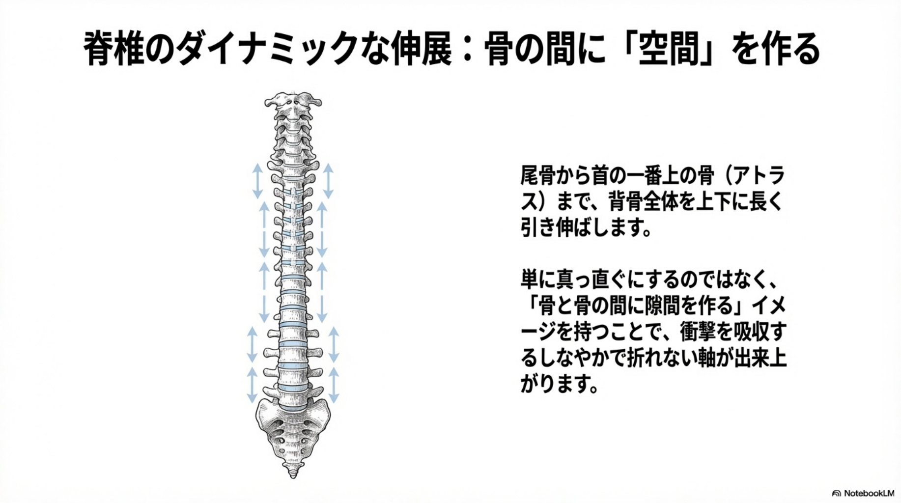 3.脊椎のダイナミックな伸展: 尾骨から、首の第一頸椎である**「アトラス(環椎)」**まで、脊椎全体を上下に引き伸ばします。椎骨の間にスペースを作る意識が、しなやかで折れない軸を構築します。この「スタッキング」は、単なるバランス保持に留まりません。物理的に腰椎や股関節への過度な負荷を逃がし、深層筋に荷重を分散させることで、ダンサーを致命的な怪我から守る戦略的な防御機構としても機能するのです。