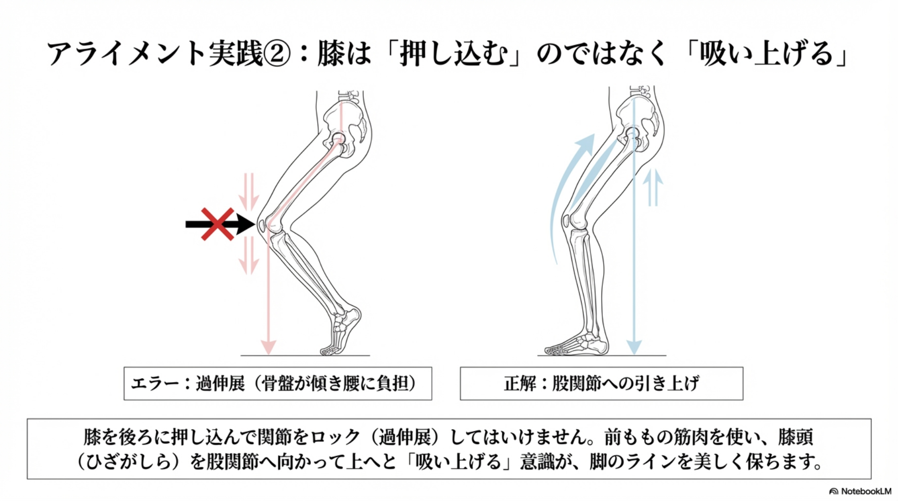 ●膝を引き上げましょう: 膝を後ろに押し込む(過伸展)のではなく、大腿四頭筋を使い、膝頭を股関節へ向かって吸い上げるように意識してください。