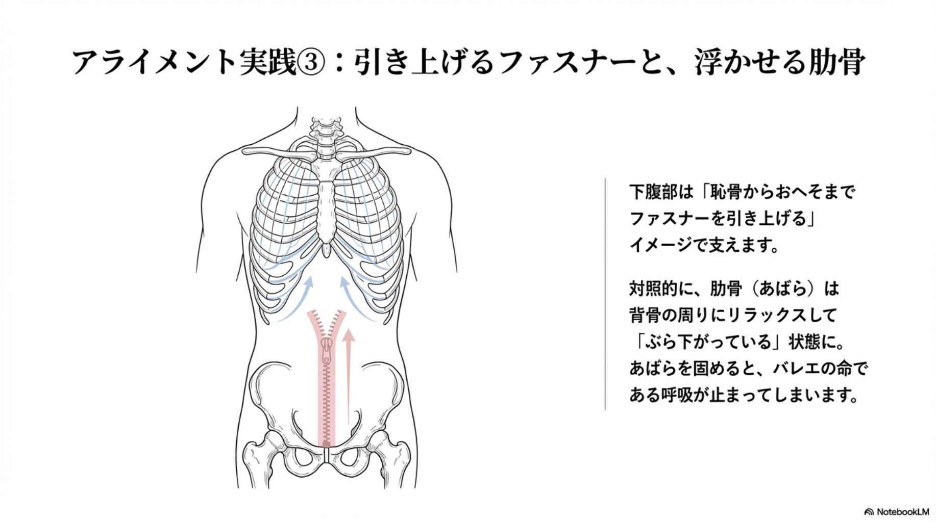 特に「あばらを締める」という注意を誤解し、腹直筋(表面の筋肉)を固めてしまうと、バレエの命である呼吸が止まります。固められた胸郭では、流麗な「ポールドブラ(腕の運び)」は不可能です。アプローンは「固定」ではなく「配置」であることを忘れないでください。